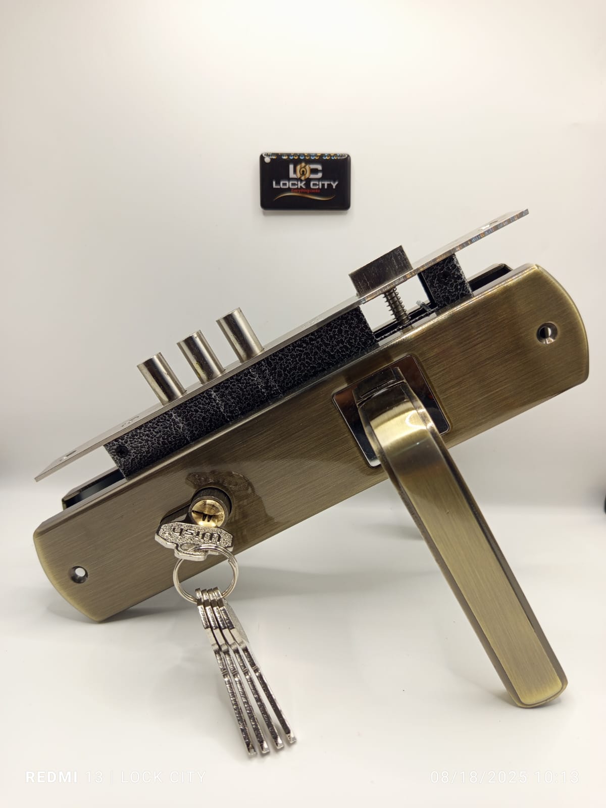This premium steel door lock combines strength, security, and elegance. Designed with a solid metal body and a sleek antique brass finish, it offers both durability and style for modern homes and offices. The lock features multiple solid bolts for enhanced protection and a smooth handle for comfortable operation. It comes with non-duplicable high-security keys, ensuring your property stays safe from unauthorized access. Ideal for wooden or steel doors, this lock delivers superior performance, reliability, and long-lasting functionality — a perfect blend of security and sophistication from Lock City.